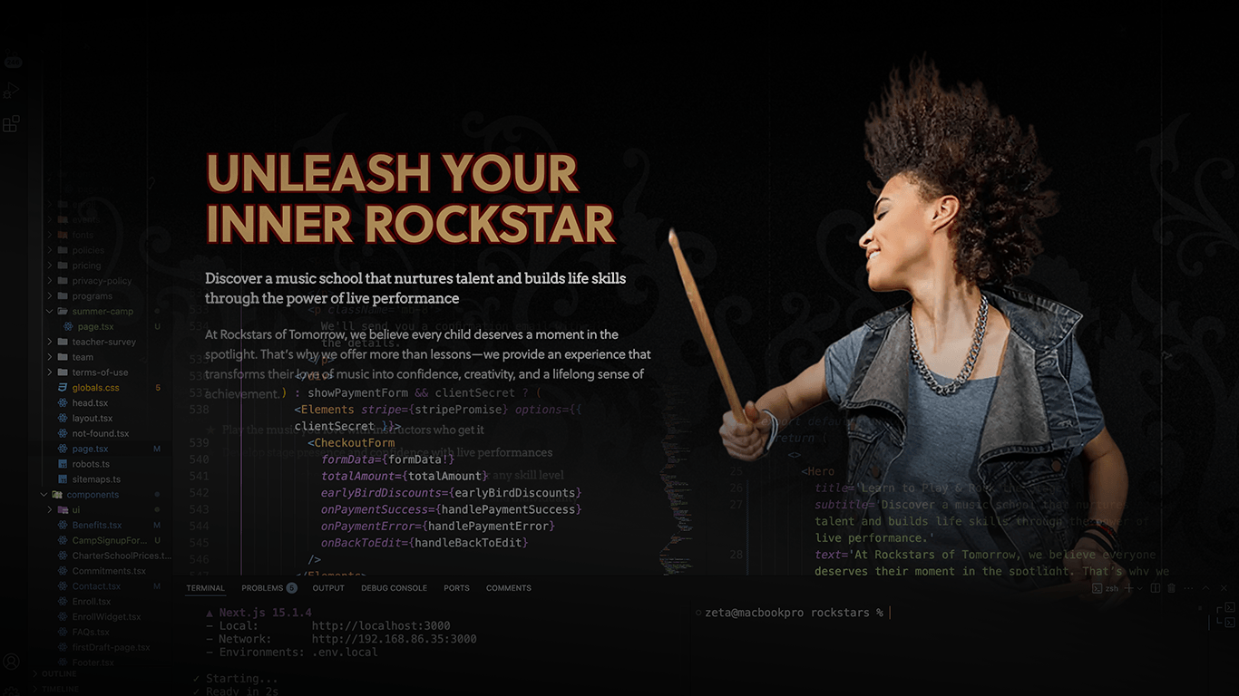 The Rockstars website represents a comprehensive digital transformation for a local music school specializing in performance-based music education.